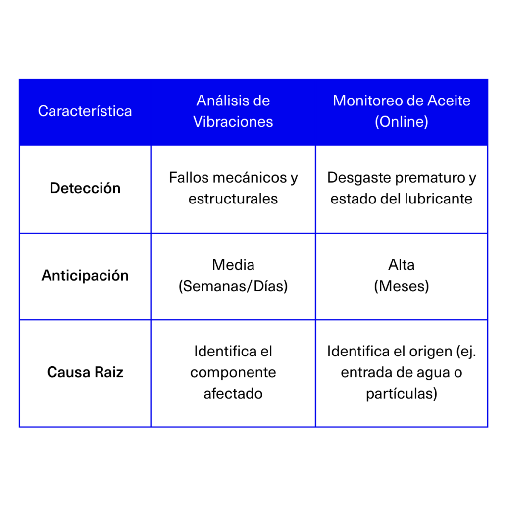 El análisis de vibraciones detecta fallos cuando ya existe una degradación mecánica (un rodamiento picado, un eje desalineado, etc.). El monitoreo de aceite, en cambio, detecta el cambio en las condiciones que causarán ese fallo antes de que la máquina empiece a vibrar.